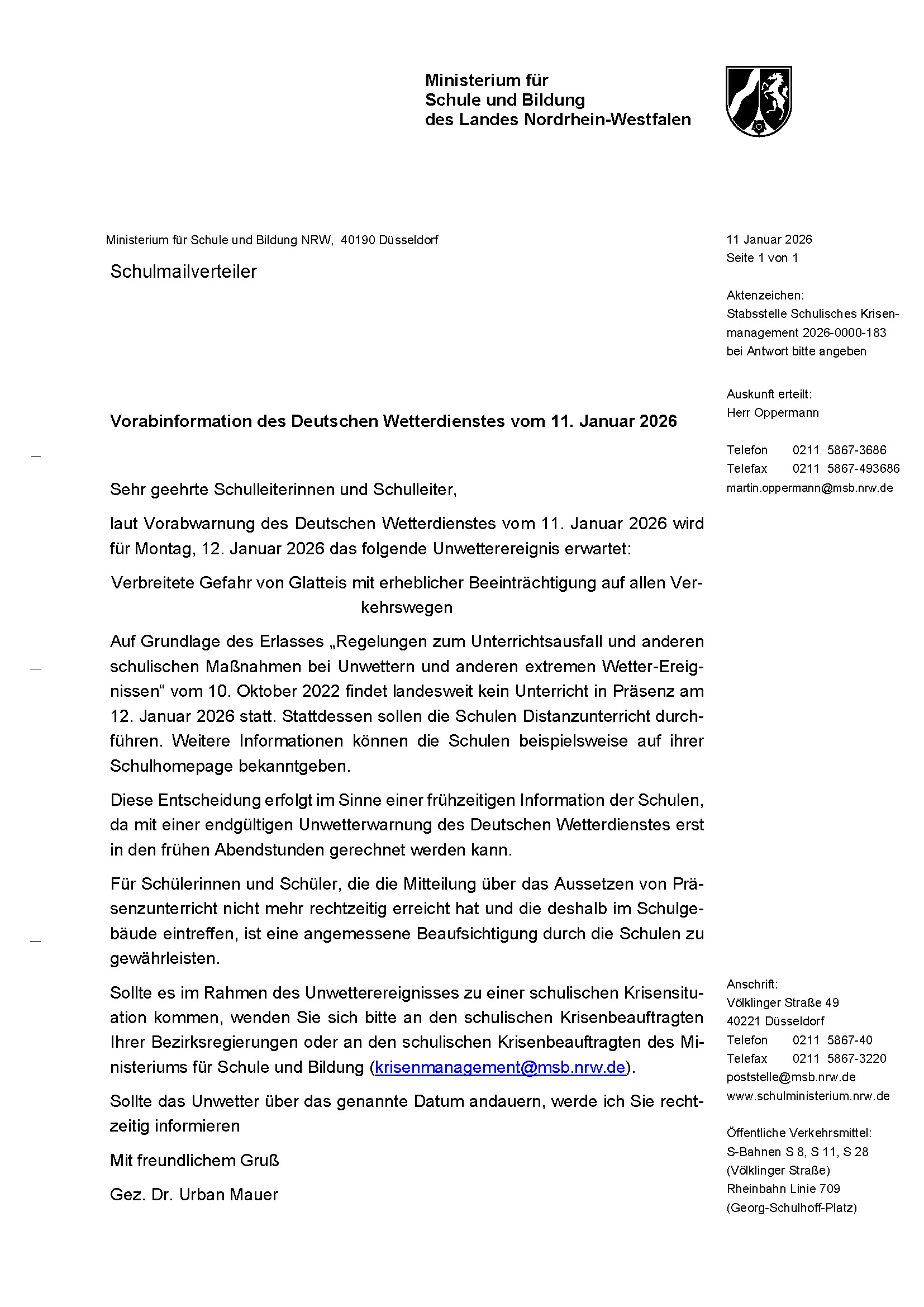 Wenn es durch das Unwetter zu einer Krisensituation an der Schule kommt, wenden Sie sich bitte an die Krisenbeauftragten der Bezirksregierung oder an das Ministerium für Schule und Bildung: krisenmanagement@msb.nrw.de